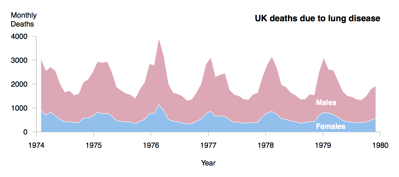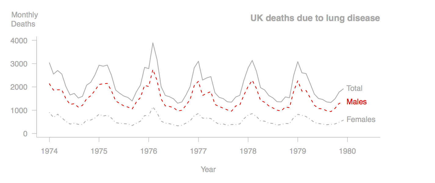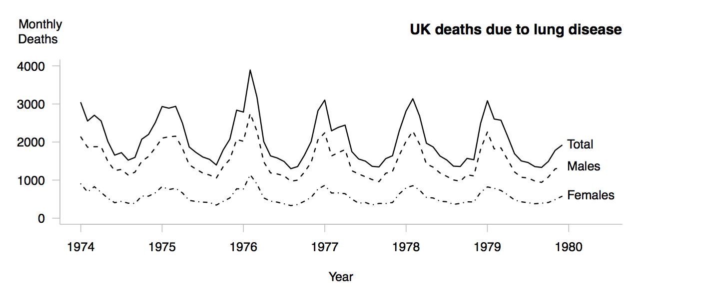 Monthly deaths due to lung disease in the UK. The dotted line shows number of female deaths, the dashed line shows male deaths, with the total shown by the solid line.